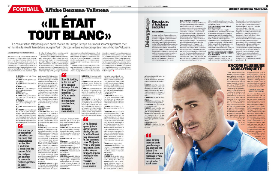 L’intercettazione pubblicata è relativa a una conversazione in cui Benzema rivela a Zenati che cosa si sono detti lui e Valbuena. Il titolo in prima pagina è il seguente: «Se tu vuoi che il video sarà distrutto, un mio amco viene a trovarti a Lione. Così lo incontri e parli direttamente con lui». All’interno il titolo: «Era bianco», con riferimento alla paura di Valbuena per la vicenda.
