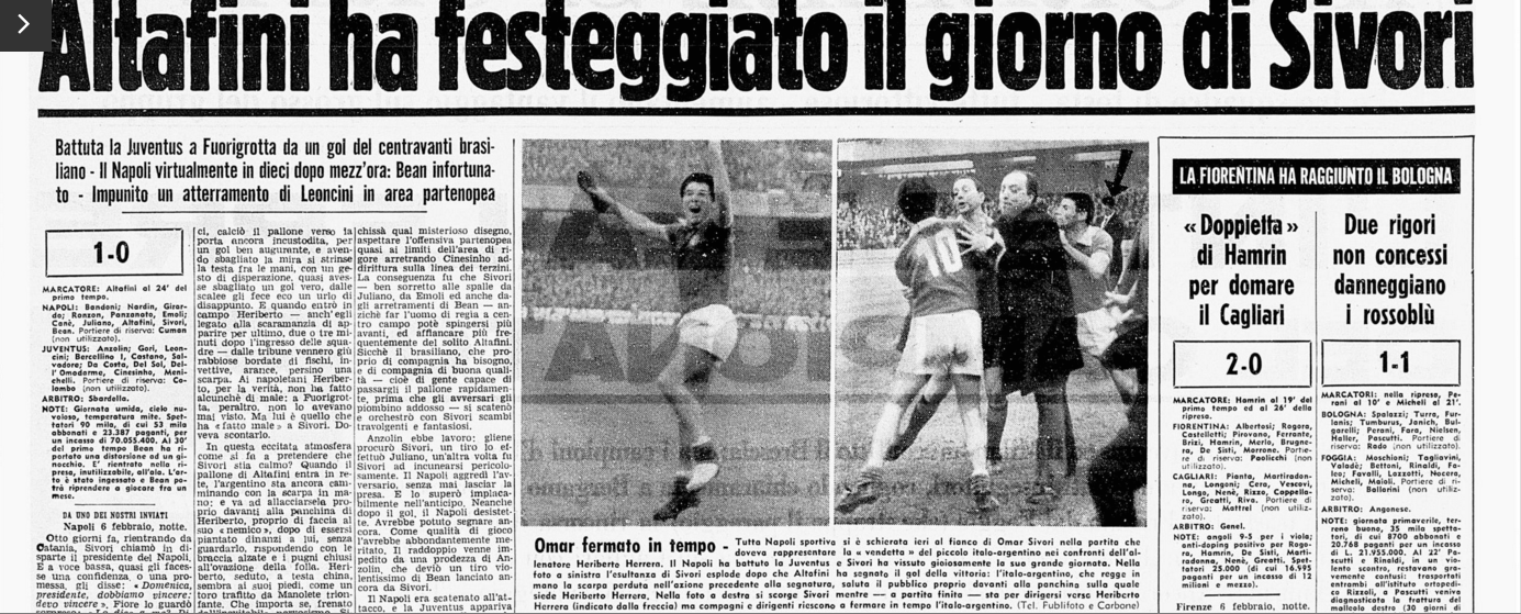 A tavola, la conversazione spaziò dapprima sugli argomenti più diversi – il clima, i napoletani, il panorama – poi pian piano Sivori portò il discorso sulla partita della domenica successiva. «Vedi – disse, rivolgendosi ad Altafini – la Juventus…». Il brasiliano gli interruppe la frase a metà, con una sonora risata. «Omar, io ho capito benissimo perché hai voluto organizzare questo pranzo. Non ti preoccupare, al 12’ segno io, e tu potrai vivere tranquillo e contento».