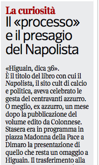 Sul Corriere del Mezzogiorno il riconoscimento per aver scritto nel libro “Higuain - Dica 36” che Gonzalo a Napoli era stato uno scambio di persona.