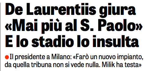 Aurelio De Laurentiis ha provato a rubare la scena alla vigilia di Napoli-Bologna. Non immaginava che di lì a due ore Arkadiusz Milik – di cui ha peraltro detto un gran bene – avrebbe stravolto le gerarchie anche giornalistiche. Protagonista di una intervista con Paolo Mereghetti a Milano, il presidente del Napoli ha conquistato i media con una serie di dichiarazioni sullo stadio che per i tifosi del Napoli non rappresentano una novità. Certo non si era mai spinto a parlare di uno stadio da ventimila posti modello teatro, e non aveva mai rivelato quel che tutti sanno: e cioè che dalla tribuna d’onore del San Paolo non si vede un beneamato tubo. Ma chi segue il Napoli, e conosce il San Paolo, lo ha sempre saputo. Ha rilasciato una serie di dichiarazioni che oggi appaiono in bella evidenza sui quotidiani. Dichiarazioni cui, sui giornali, fanno da contraltare le contestazioni della tifoseria.