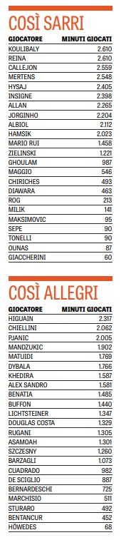 Titolarissimi e rotazioni scientifiche. È una delle grandi differenze tra Maurizio Sarri e Massimiliano Allegri, alla guida di Juventus e Napoli. Due concezioni diverse rispetto allo sfruttamento della rosa, come si evince dall’ultima analisi della Gazzetta sui minutaggi dei due organici riferiti al solo campionato. Questione di cifre: i componenti del nucleo “base” del Napoli superano tutti i duemila minuti in campo. Dieci calciatori, praticamente undici sommando le quote di Mario Rui e del lungodegente Ghoulam. Per la Juventus, invece, appena tre uomini oltre la soglia dei 2mila minuti e 13 calciatori tra i mille e i duemila minuti di gioco.