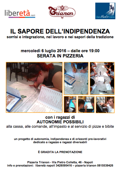 Una pizza con i ragazzi diversamente abili che si occuperanno interamente del lavoro di sala partendo dall’accoglienza al cliente seguito dalla comanda ai tavoli, la preparazione della pizza e il servizio di cassa. L’appuntamento è per mercoledì 6 luglio, a partire dalle 19.30, alla Pizzeria Trianon da Ciro, in via Pietro Colletta a Napoli. Titolo della serata è “Il sapore dell’indipendenza, sorrisi e integrazione, nel lavoro e nei sapori della tradizione”, i ragazzi sono quelli di“Autonomie possibili”, un progetto di autonomia, indipendenza e di apertura a possibili orizzonti pre-lavorativi, dedicato a ragazze e ragazzi diversabili.