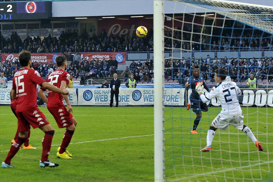– Al 38′ altro regalo della nostra retroguardia. Il laterale isolano si è infilato a sinistra sul filo del fuorigioco e ha servito l’indisturbato Ibarbo al centro dell’area. Tiro non proprio pulito e palla giusto nell’angolino. Mi accodo a Veronesi e dico che Dio non esiste. Più o meno come Hamsik ieri.