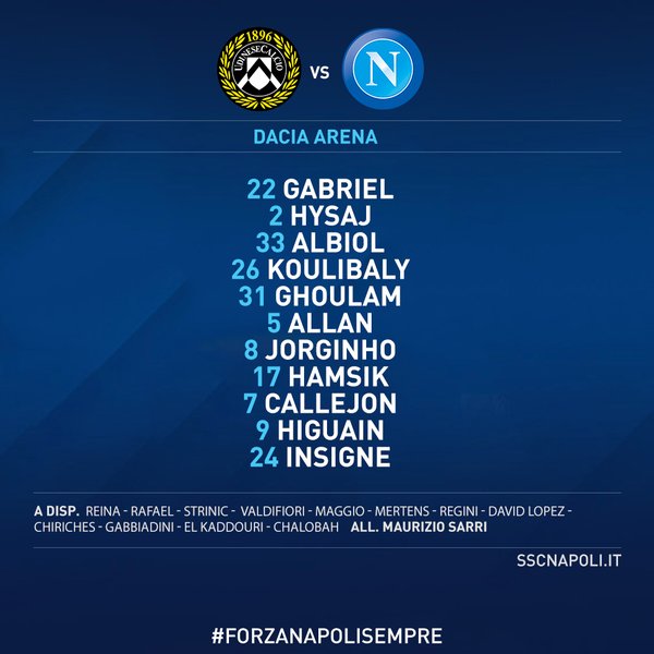 A disposizione: Rafael, Reina, Chiriches, Strinic, Regini, Maggio, Grassi, D. Lopez, Valdifiori, Chalobah , El Kaddouri, Mertens, Gabbiadini. All. Sarri