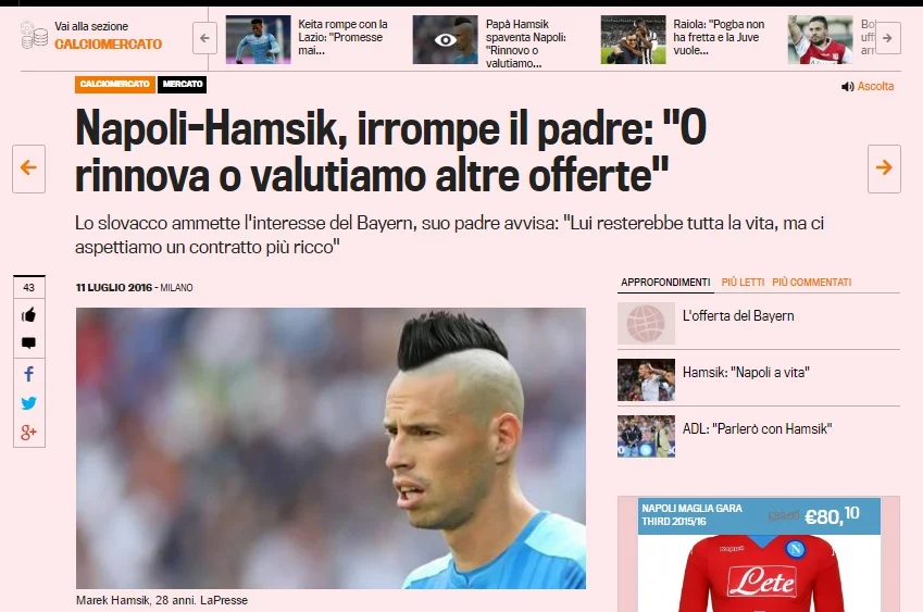 Per chi non ha voglia di aprire la pagina, vi riportiamo velocemente il contenuto. Questo il titolo: “Napoli-Hamsik, irrompe il padre: “O rinnova o valutiamo altre offerte”. Questo, invece, è il contenuto: «A parlare, stavolta, è stato papà Richard, anche se le dichiarazioni diffuse soltanto ora in Italia in realtà sono state rilasciate il 30 giugno. “Marek dice sempre che il Napoli è il club che ama e che vorrebbe chiudere la sua carriera in azzurro, ma non è ancora sicuro che accada – ha spiegato papà Hamsik -. Noi ci aspettiamo un contratto più ricco. Se ci sarà la volontà di valutare Marek come merita resteremo a Napoli, in caso contrario si penserà ad altre offerte. E’ vero che i tifosi in caso di cessione non la perdonerebbero mai, ma loro possono avere una visione completamente diversa delle cose”.