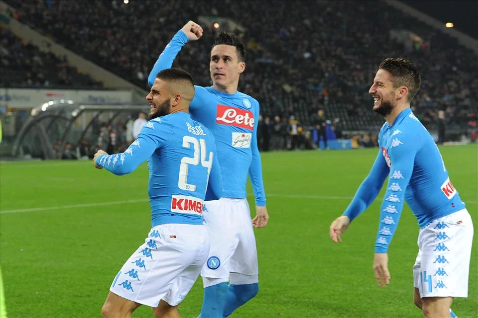 La gioia del tridente dopo il primo gol di Insigne a Udine (foto Cuomo)