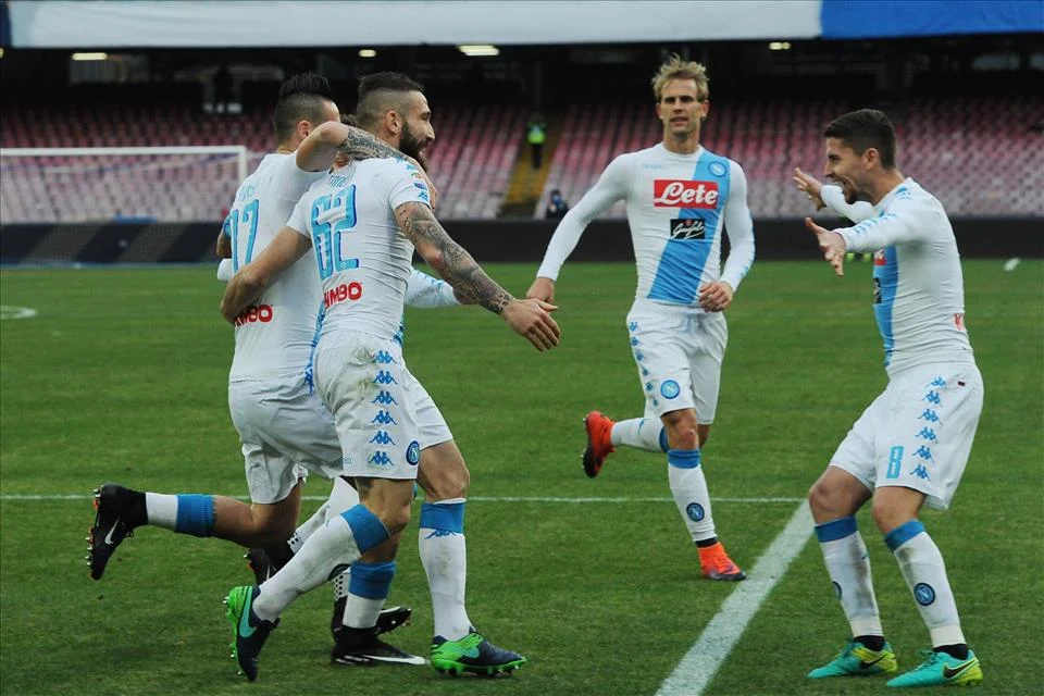 Jorginho festeggiato da Tonelli e gli altri dopo l'assist del primo gol (Cuomo)