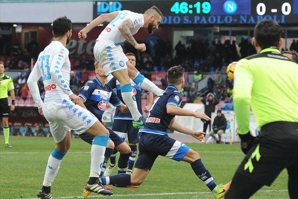 Primma ‘e ricresso (ritorno) ajere ô san Paolo ‘nnante a trentamila ‘e lloro…. e sse cunfermaje ‘o fatto ca ‘e pruberbie antiche nun fallesceno maje; cumminfatte comme se dice? Nun c’è ddoje senza tre!E accussí succedette: chella d’ajere [Coppa itaglia cumpresa] fove ‘a terza mubbara (partita) cunzecutiva jucata ô san Paolo cu ‘e pprimmi ddoje vinciute. Quindi perindi po s’êv’’a vencere pure ‘a terza! I ‘a nichemata (vittoria) nun mancaje pure si êsse pututa essere cchiú sustanziosa ‘e chella ca fove si arrivate ô 93’ ‘ncopp’ô tre a zzero pe nnuje Hysaj nun êsse fatto ‘na fessaria inutile rijalanno ‘nu ricore ô Piscara ca n’apprufittaje signanno ‘o stuco (gol) d’’a bbannera. Che peccato!