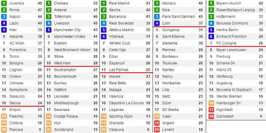 Facendo una veloce ricognizione fuori dai confini italiani per vedere come vanno le cose negli altri campionati top europei, e preso come indice di paragone il margine di 11 punti dall’ultima squadra oggi virtualmente retrocessa possiamo verificare la situazione. In Premier League la terz’ultima ha 16 punti, nella spazio di 11 punti sono comprese ben sette squadre fino al Southampton undicesimo. Nella Liga la terz’ultima ha 13 punti e nello scarto considerato ci sono sei squadre fino all’Alaves dodicesimo; nella Ligue1 la terz’ultima ha 21 punti e addirittura negli 11 punti sopra di lei sono incluse le squadre fino alla quinta posizione. Infine la Bundesliga, unica a 18 squadre, ha la terz’ultima che totalizza 13 punti con ben otto squadre nello spazio di undici lunghezze. La Serie A è un caso unico dunque, nella maniera peggiore.