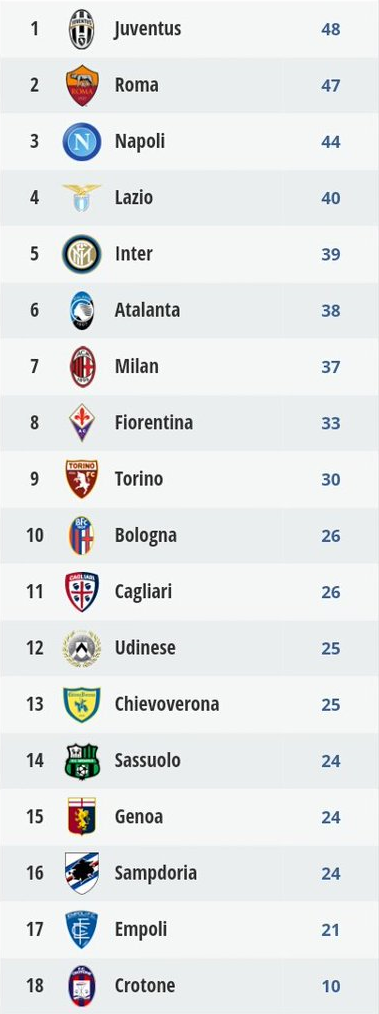 Ipotizzando la Serie A con 18 squadre con formula tedesca (due retrocessioni dirette e uno spareggio tra terz’ultima di A e terza di B) quale sarebbe la situazione oggi? Come possiamo vedere nell’immagine seguente, il Crotone risulterebbe comunque spacciato, ma sarebbero in lotta per la salvezza ben 9 squadre con il Torino a sole sei lunghezze dalla Sampdoria terz’ultima.