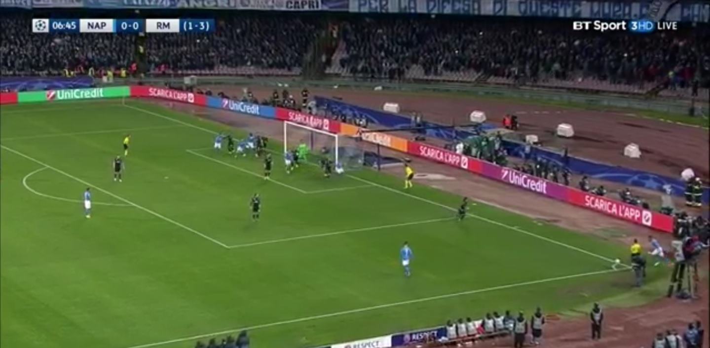 Il Napoli, come leggiamo da questi dati, soffre sicuramente un missmatch a livello di centimetri. Lo stesso Ramos non è altissimo – pur essendo universalmente riconosciuto come uno dei saltatori più forti del panorama europeo -, eppure solo tre calciatori in campo ieri con la maglia azzurra svettavano su di lui: Albiol, Koulibaly e Ghoulam (a parte Reina, che però ha degli impegni che gli impediscono di marcare sui corner). Il problema di ieri sera, oltre che l’abilità del centrale andaluso, risiedeva negli altri: Ronaldo, Benzema, Pepe, Bale. Una batteria di saltatori impressionante. Come spiegato da Sarri, la marcatura a zona serve proprio per cercare di colmare questo gap attraverso il posizionamento. Il Napoli non c’è riuscito, in entrambi i gol.