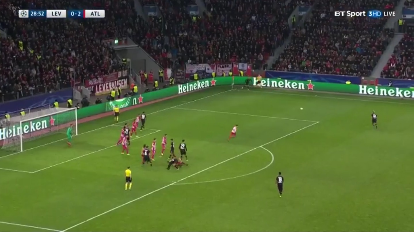 Su corner battuto corto dal Bayer Leverkusen, si capisce la natura duplice della difesa di Simeone. Si formano duelli individuali in zone dell’area non prossime alla linea di porta, ma ci sono anche calciatori colchoneri liberi a copertura di una porzione di campo. Possiamo definire questo sistema come ibrido, però è visibile un orientamento all’avversario più che all’occupazione dello spazio. Diciamo uno a uno.