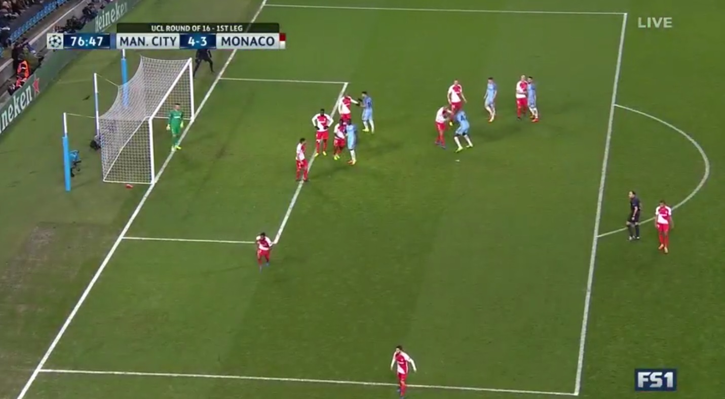 Come il Psg, forse è una situazione tipica della Francia. Copertura della zona con una prima linea e duelli individuali lontani dalla porta. Curioso il fatto che ci siano otto calciatori in area e due praticamente attaccati alle linee di delimitazione della sedici metri. Anche questa, seppur meno estrema, è marcatura a zona. Otto a tre.