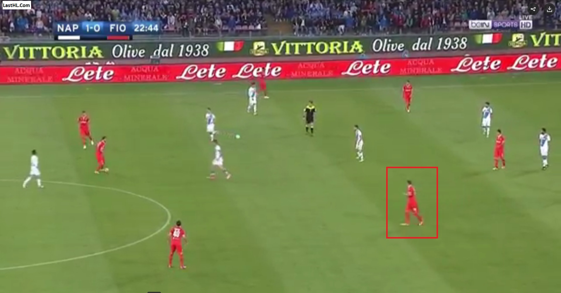 A differenza di Ilicic, Mertens non occupa una posizione di trequartista o di esterno offensivo. Per un difensore, il belga è (dovrebbe essere) l’uomo di riferimento nella copertura della propria area. Il movimento a retrocedere di Mertens crea confusione difensiva, perché nel frattempo Callejon attacca la profondità e Insigne è larghissimo e può ricevere. La distanza tra gli uomini in campo, dovuta anche alla pigrizia di Bernardeschi nel chiudere la linea a cinque, è una dinamica imposta dal Napoli. Dall’interpretazione di Mertens di un ruolo che ormai padroneggia. A modo suo, soprattutto in situazioni offensive di questo tipo.