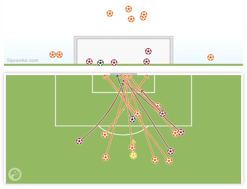 In rosso i tiri nello specchio; colore giallo per le conclusioni ribattute; in arancione i tentativi finiti lontano dai pali.