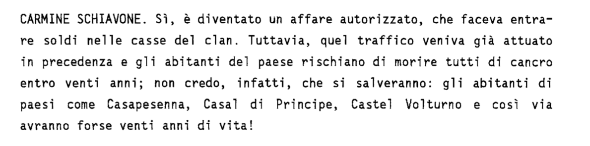 L’audizione è qui, vale la pena leggerla. È una sceneggiatura perfetta. Business, camorra, rifiuti radioattivi, massoneria, Licio Gelli. Tutto quanto fa titolo. Perché nel giornalismo il titolo è tutto. Dateci un titolo e conquisteremo il mondo. E l’avvelenamento delle falde acquifere è un titolone. Vent’anni dopo, vale la pena di osservare che il pentito Carmine Schiavone aveva leggermente esagerato. Appena appena.