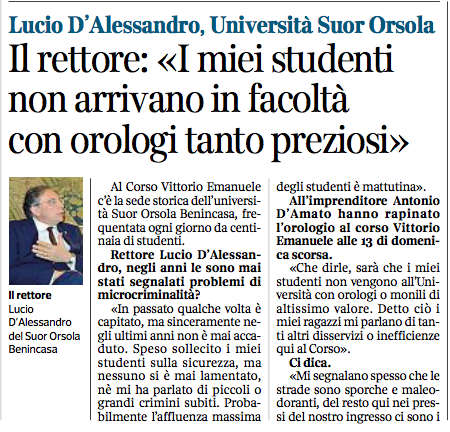 Alla domanda-informazione “All’imprenditore Antonio D’Amato hanno rapinato l’orologio al corso Vittorio Emanuele alle 13 di domenica scorsa”, risponde così: «Che dirle, sarà che i miei studenti non vengono all’Università con orologi o monili di altissimo valore. Detto ciò i miei ragazzi mi parlano di tanti altri disservizi o inefficienze qui al Corso».