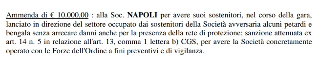 Il sito della Lega Serie A ha pubblicato il comunicato ufficiale in merito alle decisioni del Giudice Sportivo dopo la 24esima giornata di Serie A. Due notizie per il Napoli: intanto, 10mila euro di multa per il lancio di materiale pirotecnico, da parte dei tifosi, verso il settore ospiti. Sotto, l’estratto della nota riferito all’ammenda.