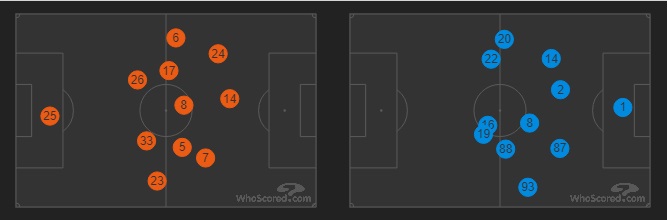 Tutte le occasioni migliori del Napoli nascono in questo modo. Il tiro di Allan alto sulla traversa nasce da una penetrazione di Mertens sulla sinistra; il palo del centravanti belga, in apertura di ripresa, si origina da un suo movimento classico a stanare il centrale avversario, una sorta di scivolamento arretrato che apre lo spazio per la conclusione. Non è un caso che, mai come in questa partita, la posizione di Mertens sia stata mutevole. Sotto, la heatmap dell’attaccante del Napoli. La sua tendenza ad allargarsi a sinistra è ben visibile.