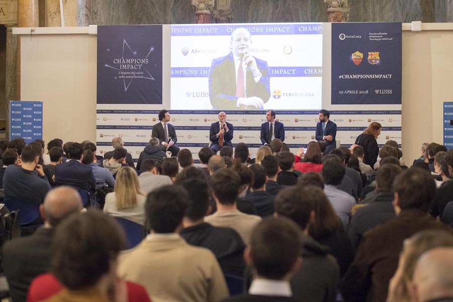 Il big match dell’Olimpico ha fornito questa mattina l’occasione per parlare di calcio dentro l’università, con i dirigenti delle due squadre che si affronteranno stasera, grazie a uno speciale laboratorio organizzato dall’associazione ItaliaCamp. Quando Mauro Baldissoni ha iniziato a parlare alle 10 davanti a una platea gremita di studenti, per un attimo è apparso quasi surreale che fosse una lezione universitaria. “Non so dire se il valore di una squadra di calcio sia tangibile o intangibile” ha detto il Dg romanista, “è un business che si fonda sulle emozioni, noi produciamo e distribuiamo emozioni”. Nell’aula magna alla Luiss di viale Romania si è scelto il calcio per spiegare agli studenti di economia come scovare il valore nascosto di alcuni asset invisibili, che normalmente non compaiono in un bilancio, ma che a un certo punto potrebbero determinare la crescita futura non solo per il proprio club, ma per una platea più larga di interessi collegati.