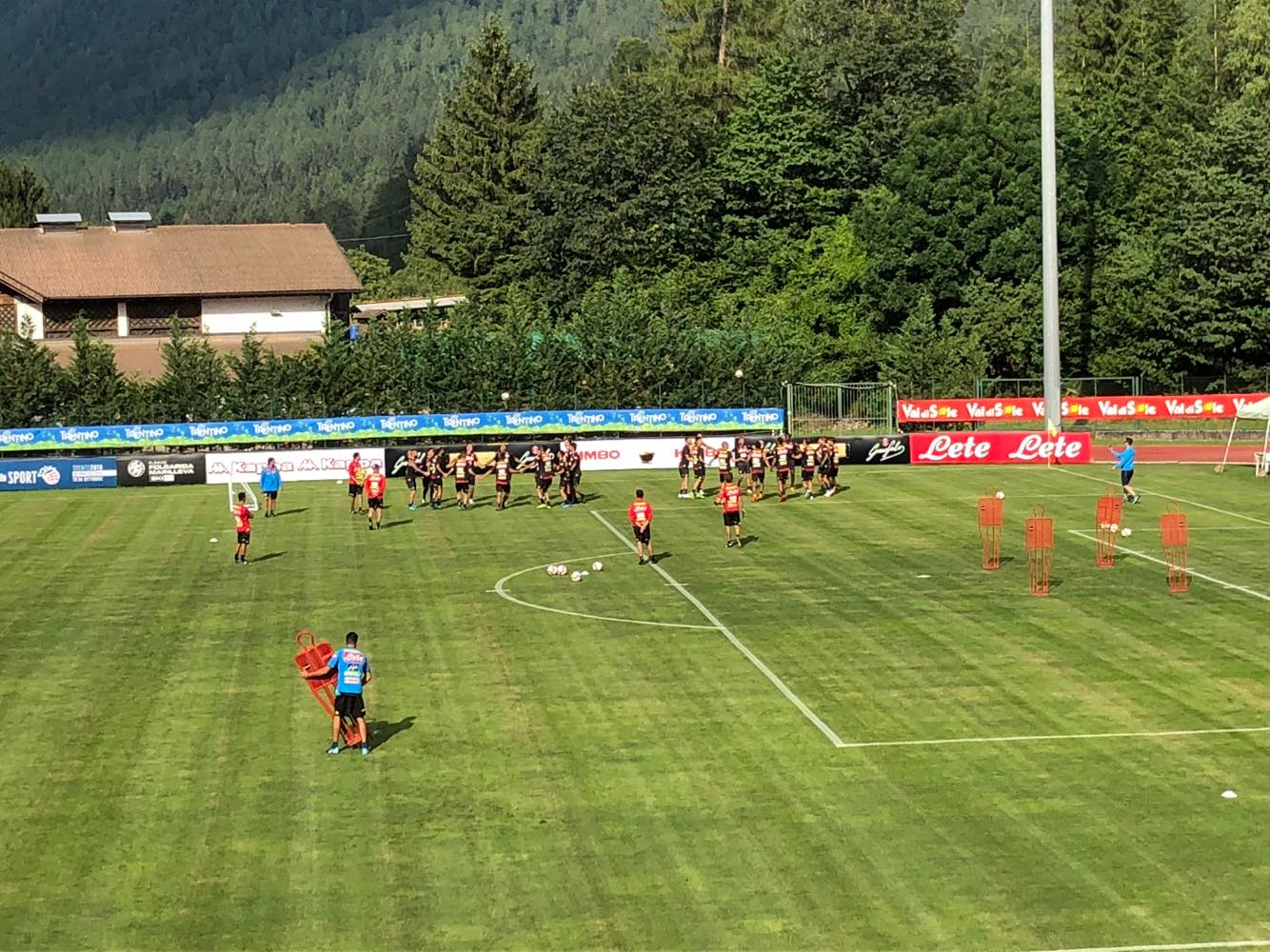 È solo l’inizio, pochi minuti dopo la squadra viene divisa in due cerchi, i calciatori si tengono per mano e hanno un compito difficile: palleggiare in quella posizione, senza mollare mai la presa con i compagni. È un giochino divertente, i giocatori sembrano reagire bene a questi stimoli, si prendono in giro, il pubblico applaude quando i calciatori riescono a non far cadere il pallone per qualche minuto. Anche questo lavoro è puramente tecnico, è controllo di palla e del tocco in situazione di equilibrio precario. E poi c’è anche il pubblico che vuole vedere qualcosa per cui valga la pena, e questo è un momento che va anche in questa direzione.