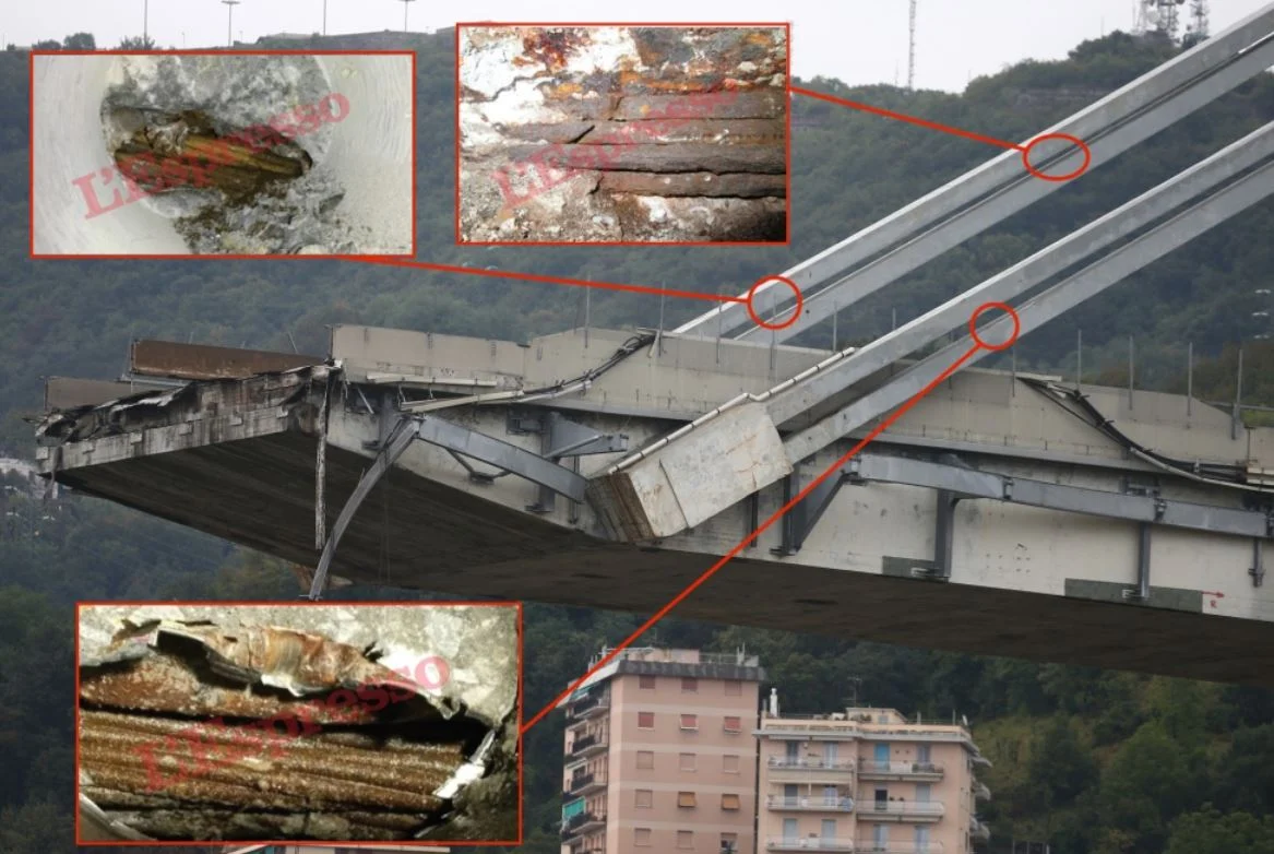 Il materiale risale a due ispezioni compiute dalla Spea: una dell’agosto 2011 e l’altra del maggio 2013. Nei documenti si legge che i ferri a vista “sono risultati deformabili anche solo facendo leva con uno scalpello: si può quindi ritenere che non presentino più la tensione prevista e siano da ritenere non efficaci”.