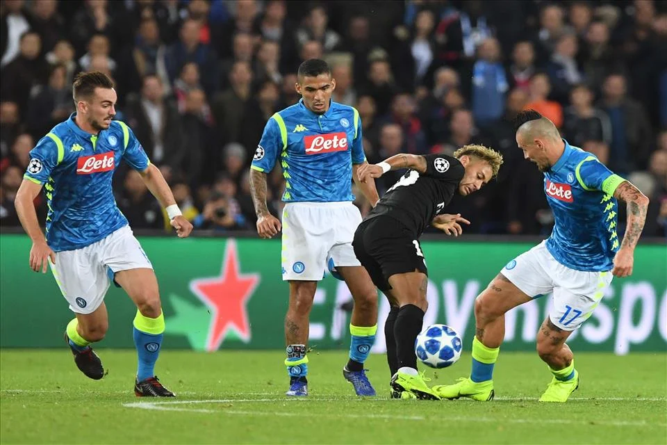 Lo schieramento offensivo 2-1 di Tuchel scompagina il 4-4-2 del Napoli, Koulibaly deve uscire altissimo su Neymar ma non riesce ad anticipare il tocco di prima del brasiliano, che chiude il triangolo con Mbappé.
