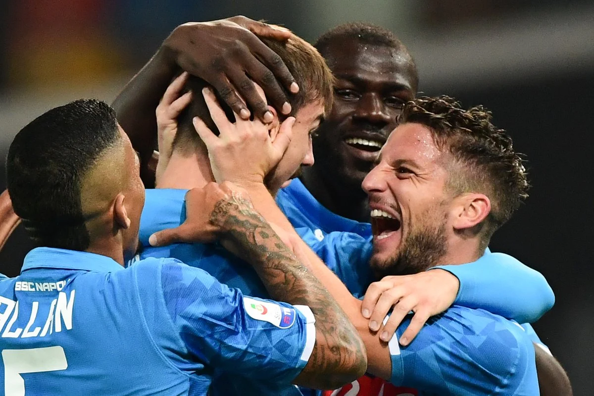 Fabian Ruiz festeggiato dai compagni dopo il gol a Udine (SSC Napoli)