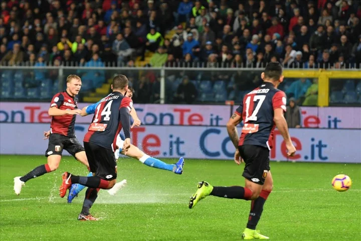 Il tacco di Dries Mertens non è un exploit. O meglio: è un exploit nell’esecuzione, non tanto nell’idea. Pochi minuti prima, il belga e Fabián Ruiz si erano già trovati sulla fascia sinistra, dall’altra parte, poco prima che il terreno di Marassi diventasse una poltiglia fangosa. Solo che il tiro a giro del belga è andato oltre il palo alla sinistra di Radu.