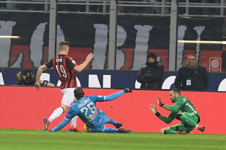 Al quarantasettesimo, Ci prova Kessie, ma Malcuit devia in angolo il bolide dell’ivoriano. Qualche minuto dopo ci prova Paquetà ma Ospinna respinge. Due minuti più tardi e la volta di Callejon, lato opposto, traversa sfiorata. Il Napoli in questa fase si fa più coraggioso, gli uomini in attacco sono tanti, i rossoneri a tratti sembrano in affanno e la squadra azzura sembra in grado di poterne approfittare. Al sessantaquattresimo, dialogo tutto polacco tra Zielinski e Milik, l’attaccante prova il colpo ma Donnarumma ancora una volta, blocca. Gattuso al settantunesimo fa entrare in campo Piatek, al posto di Cutrone, San Siro in delirio, speaker impazzito, telecronisti Dazn alle lacrime, Piatek, sì. Ancelotti, evidentemente intimorito dall’ingresso in campo di…Piatek tira fuori Mario Rui per Ghoulam.