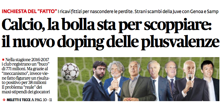 Il Fatto: “Sta per scoppiare la bolla plusvalenze, il nuovo doping del calcio”