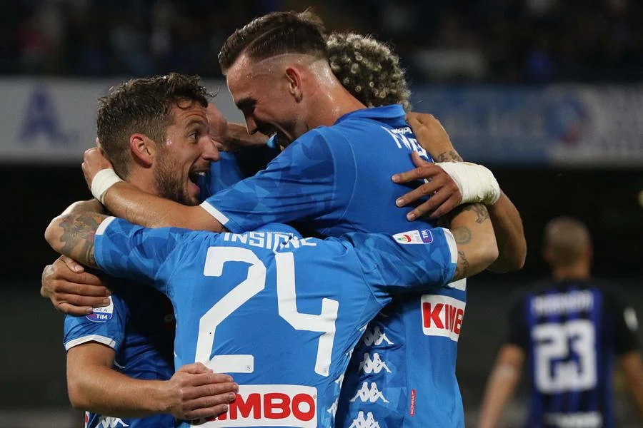 Napoli's midfielder Fabian Ruiz jubilates with his teammate after scoring the goal 4-0 during italian Serie A soccer match between SSc Napoli and Inter FC the San Paolo stadium in Naples, 19 May 2019 ANSA / CESARE ABBATE