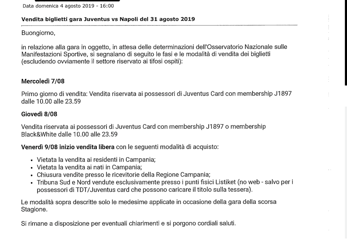 Quando c’è di mezzo la Juventus, è sempre tutto molto faticoso. Oggi la Juventus ha risposto alla Questura pubblicando la mail inviata alla polizia di Torino, mail in cui comunica che la vendita dei biglietti di Juventus-Napoli è vietata ai nati in Campania e aggiunge che sono le stesse modalità di vendita dello scorso anno.
