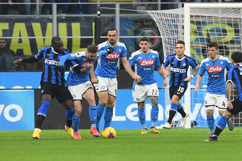 ’E cuane (azzurri), urganizzate, gidde a zabballà (bravi a palleggiare) e mmise a mmestiere ‘ncampo, doppo d’avé sbarrata ògnelinia ‘e pasiglio (passaggio) pe tutt’’o primmoajone (tempo) ê lucaleca ‘mprattecanunrumpetteno ‘o saciccio a Ppastacrisciuta, ‘ncapo appena ‘e durice minute ‘e ll’arrancua (ripresa) casticajeno ‘a Bbisciona cu ‘natimidda(ripartenza) firmata Di Lorenzo-Anemalonga epp’’o riesto ‘e ll’arrancuaazzettajeno (concessero) poco o niente â chiettaLautaro-Lukaku.
