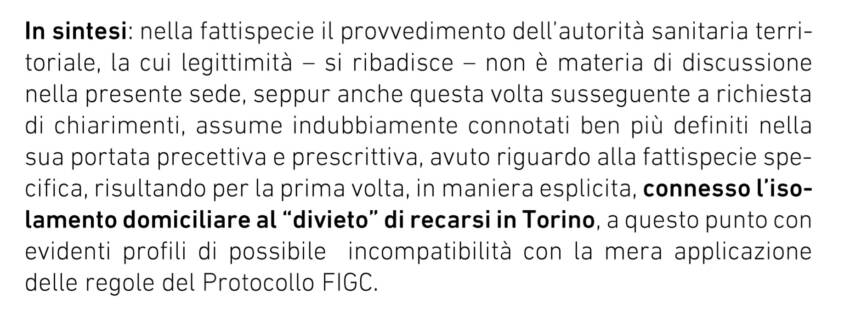 Gli atti delle Aziende sanitarie delineano un quadro che non appare al Giudice affatto incompatibile con l’applicazione delle norme specifiche dell’apposito Protocollo sanitario FIGC e quindi con la possibilità di disputare l’incontro di calcio programmato a Torino.