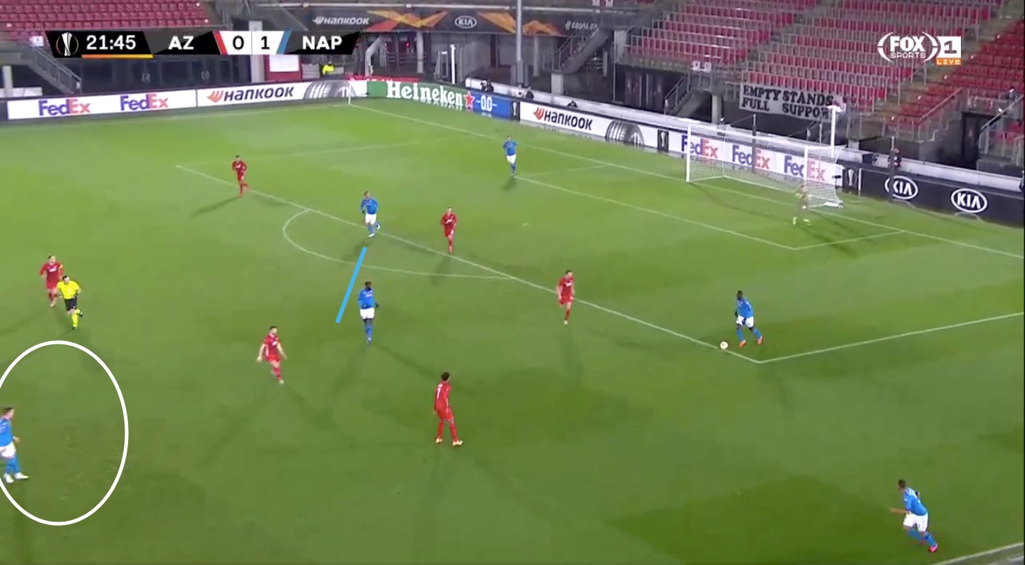 Come si vede in questo frame, l’azione da cui è scaturito il gol di Mertens è stata costruita con lo stesso principio, solo in un’altra zona del campo. Un triangolo diverso, composto da Zielinski-Bakayoko-Ghoulam, ha attirato la pressione dell’AZ e ha creato i presupposti per aprire il pallone a destra, sul lato debole – dopo un passaggio sbagliato e un successivo recupero palla di Mertens.