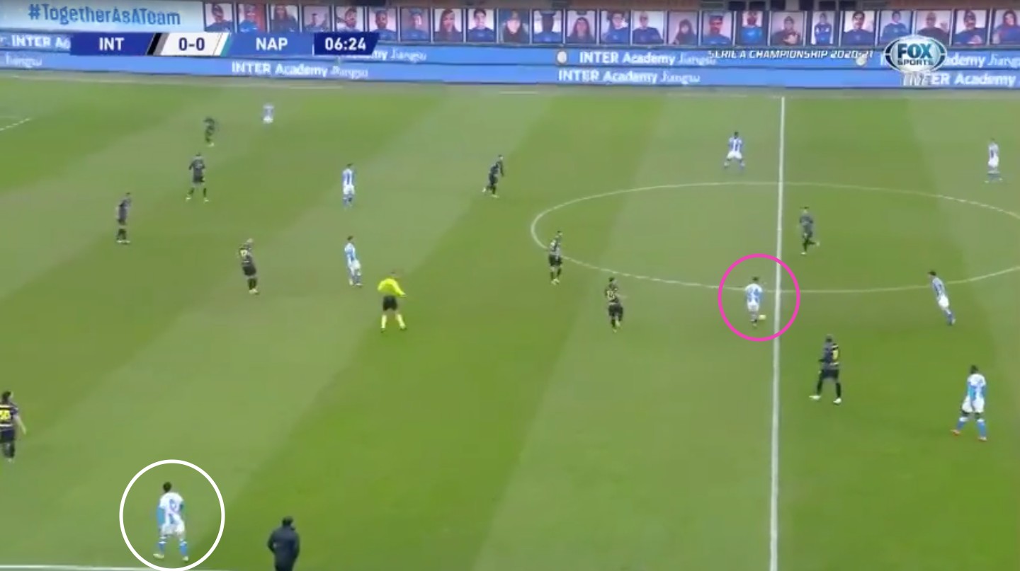 Nel primo frame, si vede chiaramente la difesa a tre in fase di impostazione. Insigne, nel cerchio rosa, è nella posizione di mezzala sinistra. Nel secondo frame, invece, vediamo come Mário Rui (nel cerchio bianco) abbia giocato più largo e (molto) più avanzato rispetto a Insigne (sempre cerchiato di rosa); Zielinski e Mertens sono sulla stessa linea, mentre Lozano, a destra, è molto largo e da lì, spesso, ha attaccato la profondità.