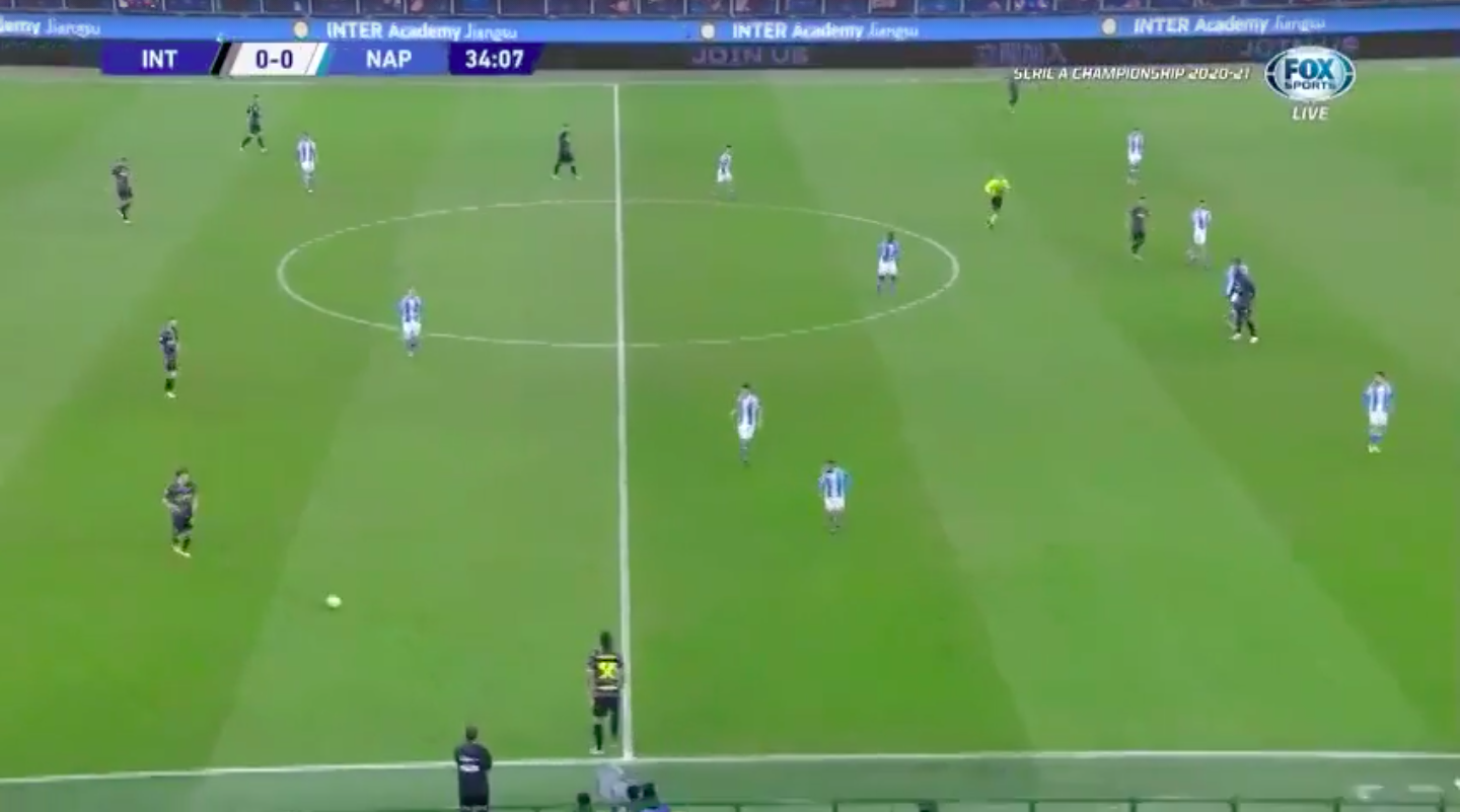 I due attaccanti sono stati seguiti praticamente a uomo da Manolas e Koulibaly, con i due terzini pronti a raddoppiare – anche perché i due esterni a tutta fascia venivano presi anche da Insigne e Lozano. Il possesso palla iniziale dell’Inter, con il solito rombo di costruzione formato dai tre difensori e da Brozovic, spostava la palla troppo lentamente perché il sistema del Napoli potesse disunirsi.