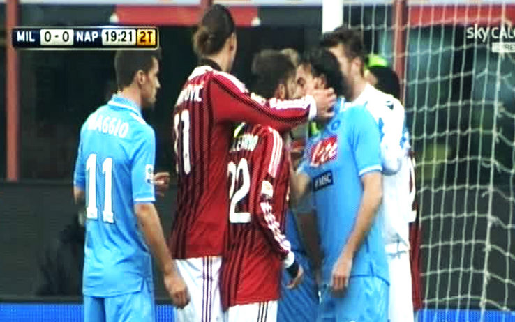 C’è anche un episodio napoletano: Milan-Napoli, novembre 2016. Ibra a gioco fermo rifila uno schiaffo a Salvatore Aronica, ma nasconde dietro Nocerino. Aronica risponde con una manata al povero Nocerino, che resta interdetto, “come Totò nel celebre sketch”. Ibra espulso.
