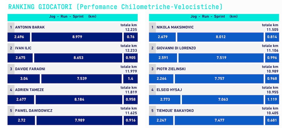 Quelli della Lega diversificano i chilometri percorsi da ciascun calciatore: jogging, corsa e sprint. Ebbene, per quel che riguarda Verona-Napoli, i primi cinque calciatori con più chilometri totali percorsi sono tutti della squadra di Juric: Barak (12,2 chilometri), Ilic (12,2), Faraoni (11,9), Tameze (11,8) e Dawidowicz (11,6). Il confronto con i migliori cinque del Napoli è impietoso. Il quinto calciatore azzurro con più chilometri è Bakayoko con 10,4 chilometri, quasi due in meno rispetto a Barak.