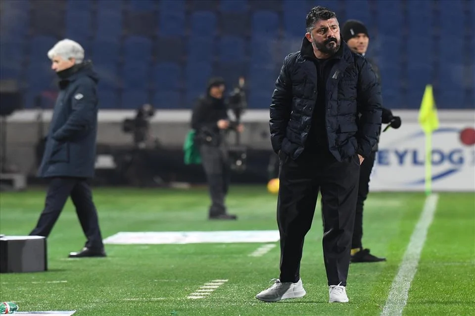 Il tecnico del Napoli Rino Gattuso in conferenza stampa dopo la sconfitta contro l’Atalanta in Coppa Italia