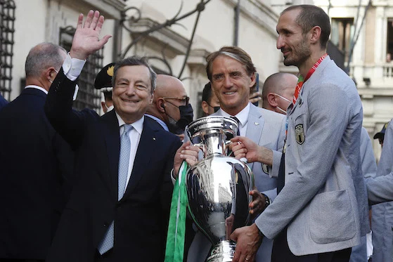 Roma 12/07/2021 - Nazionale di Calcio Italiana a Palazzo Chigi / foto Insidefoto/Image Sport nella foto: Mario Draghi-Giorgio Chiellini-Roberto Mancini