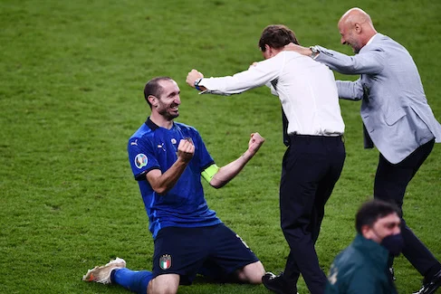 Mg Londra (Inghilterra) 11/07/2021 - Euro 2020 / Italia-Inghilterra / foto Matteo Gribaudi/Image Sport nella foto: Giorgio Chiellini-Roberto Mancini