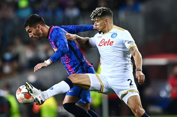 Db Barcellona (Spagna) 17/02/2022 - Europa League / Barcellona-Napoli / foto Daniele Buffa/Image Sport nella foto: Ferran Torres-Kevin Malcuit