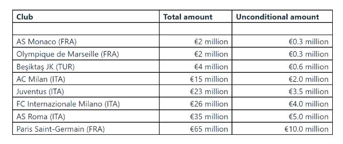 “La Prima Sezione del Club Financial Control Body (CFCB), presieduta da Sunil Gulati, ha annunciato oggi una serie di decisioni che coinvolgono i club che hanno partecipato alle competizioni UEFA per club 2021/22. La Prima Sezione del CFCB ha rilevato che AC Milan (ITA), AS Monaco (FRA), AS Roma (ITA), Beşiktaş JK (TUR), FC Internazionale Milano (ITA), Juventus (ITA), Olympique de Marseille (FRA) e Paris Saint-Germain (FRA) non ha rispettato il requisito del break-even. L’analisi ha riguardato gli esercizi 2018, 2019, 2020, 2021 e 2022. Gli esercizi 2020 e 2021 sono stati oggetto delle misure di emergenza Covid volte a neutralizzare gli effetti negativi della pandemia. In base a queste misure, gli esercizi finanziari 2020 e 2021 sono stati valutati come un unico periodo e ai club sono stati concessi adeguamenti specifici per il covid-19 e per calcolare la media del disavanzo combinato del 2020 e del 2021. Ulteriori informazioni sulle misure di emergenza possono essere trovate qui. Questi otto club hanno accettato un contributo finanziario di 172 milioni di euro. Tali importi saranno trattenuti da eventuali entrate che questi club guadagnano dalla partecipazione alle competizioni UEFA per club o pagati direttamente. Di tale importo, 26 milioni di euro (15%) saranno interamente pagati mentre il saldo residuo di 146 milioni di euro (85%) è condizionato al rispetto da parte di questi club degli obiettivi indicati nel rispettivo accordo transattivo”.