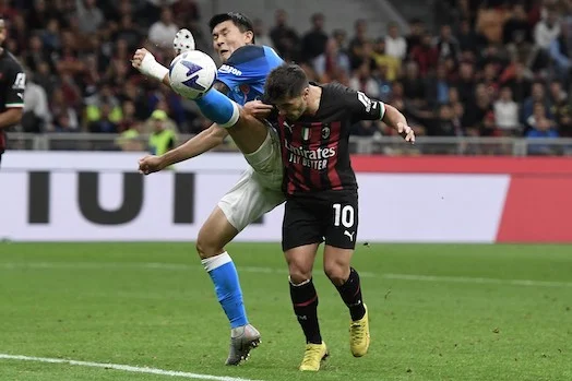 Al minuto 96 il pallone è al limite dell’area, spostato a sinistra, sui piedi di Bennacer. Che vede in area Brahim Diaz solo soletto quasi all’altezza del dischetto del rigore. Kim ha il tempo di girarsi alla sua sinistra e vedere Giroud che sta all’esterno, in area, oltre Elmas. Brahim Diaz invece è solo, all’interno. Kim si volta e in un nanosecondo decide che il pericolo principale è rappresentato dal numero 10 del Milan, Giroud può aspettare. E infatti è Diaz che Bennacer serve con un pallone che vuole imitare quello di Mario Rui per Simeone. Bennacer crossa, Brahim Diaz si ingolosisce e va verso il pallone pronto a colpirlo. Nella sua memoria è solo, non ha nessun calciatore del Napoli attorno. Non immagina che nel frattempo Kim stia sopraggiungendo. Il difensore è in ritardo, lo sa. E allora così come gli sprinter o gli atleti in generale sul filo di lana si buttano col petto, lui getta la solita gamba tesa. Che ha evidentemente il radar. E intercetta il pallone colpito di testa dallo spagnolo. Brahim Diaz probabilmente colpisce a occhi chiusi. Si aspetta il boato e invece sente troppo presto un altro colpo. È la gamba di Kim che intercetta il pallone. Brahim si mette le mani nei capelli, lo sa che gli ha tolto il gol. È disperato.