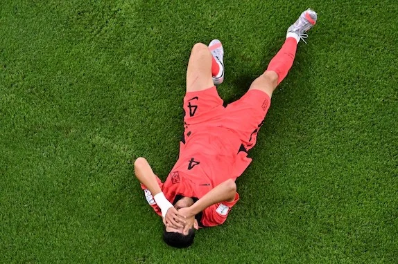 South Korea's defender #04 Kim Min-jae reacts during the Qatar 2022 World Cup Group H football match between Uruguay and South Korea at the Education City Stadium in Al-Rayyan, west of Doha on November 24, 2022. (Photo by FranÁois-Xavier MARIT / AFP)