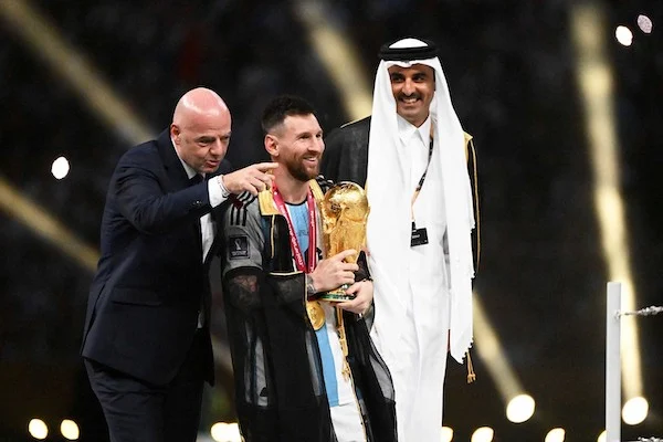 L’Emiro del Qatar e il presidente Infantino hanno vestito Messi con il bisht poco prima di consegnargli la coppa.