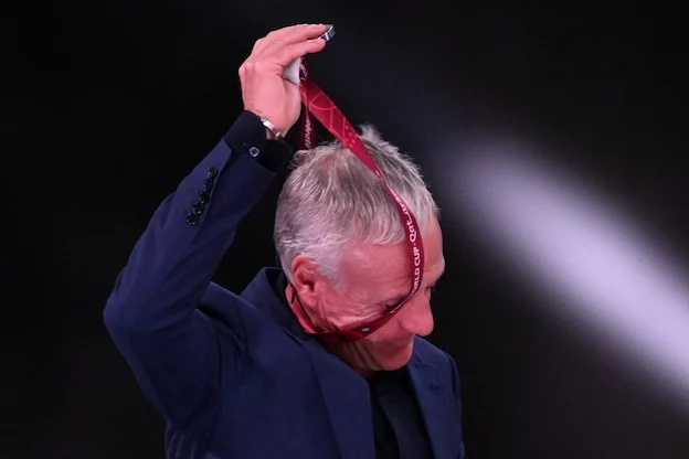 France's coach Didier Deschamps removes his medal during the trophy ceremony after France lost the Qatar 2022 World Cup final football match between Argentina and France at Lusail Stadium in Lusail, north of Doha on December 18, 2022. (Photo by Kirill KUDRYAVTSEV / AFP)