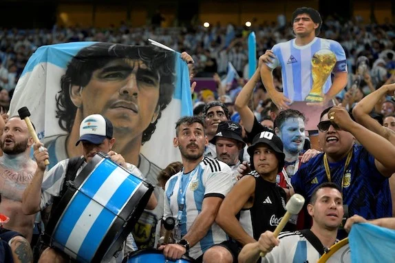 Argentina supporters play drums as they hold a country flag bearing a drawing of Diego Maradona ahead of the Qatar 2022 World Cup Group C football match between Argentina and Mexico at the Lusail Stadium in Lusail, north of Doha on November 26, 2022. (Photo by JUAN MABROMATA / AFP)
